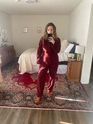 Loose, timeless fit in burgundy. Great for a day of working from home or running errands.