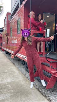 I loved this jumpsuit for a football tailgate. Fit great with some room to breathe. The material wasn’t as thick as I expected which was also a plus. Not sure if I would wear it anywhere else, but if your college colors include burgundy, I highly recommend!