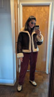 It fit a little baggy through the legs, so it can be a little frumpy. I like styling it with a T-shirt or turtleneck underneath. Definitely very comfortable.