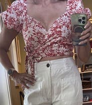 This top had a younger, casual vibe. I loved the orange floral color and the light cotton fabric. Wear with high waisted bottoms if you are tummy conscious.