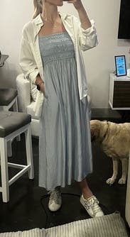 I love the baby blue fabric of this dress, everything is else was just ok for me. The fabric itself wrinkles very quickly and the light color means it shows. I was neutral on the design of the dress, but I think the combo of the design + color reads pretty young/Disney princess, which I’m ambivalent about.