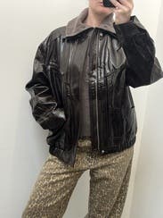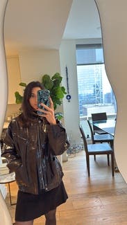 This oversized leather jacket is a must-have for fall. The shiny smooth exterior and baggy fit give it a cool, effortless vibe - and the fit makes it perfect for layering. The pockets are a great bonus, making it as functional as it is stylish.