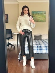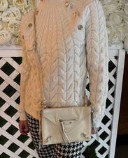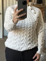 Loved the gold buttons, really elevated the sweater. But the sweater is bulky, with a thick material which made it hard to tuck and wasn’t that soft or comfortable to wear. I loved the overall look however
