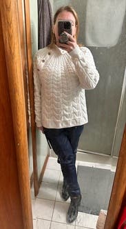 I wore this often with the APC sherpa vest, which was a good combo. This sweater is very thick and warm. There was sometimes a strange fit across the chest when I moved my arms but nothing that made the sweater unwearable. The snaps at the neck are functional (good for putting on after my hair was done) and I love the gold accent!