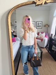 Love this top so much, might have to purchase it. It's so classic and elegant, yet looks great with denim and a black heel. The collar detail is amazing, and the length is perfect.