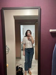 Top is cropped so must wear high waisted pant if you don't want to show midriff. wore v-neck white onesie underneath, for casual events paired with high-waisted jeans & for work paired with high-waster trouser. I'm a medium 6/8 wore size 3 and fit but tight in chest. Recommend sizing up So many compliments