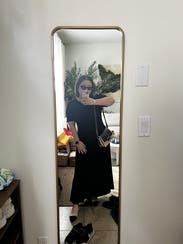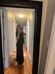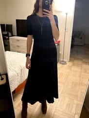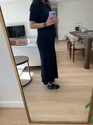 This dress is beautiful and looks high-quality. The fit is true to size, and the fabric is stretchy, so I think I could’ve also sized down comfortably. From the front it looks quite formal, but the open back is a really nice surprise and adds a stylish touch. One thing to note: I rented it thinking it was black, but next to actual black items it looks more like a very dark navy… I'm still not sure what the color really is!