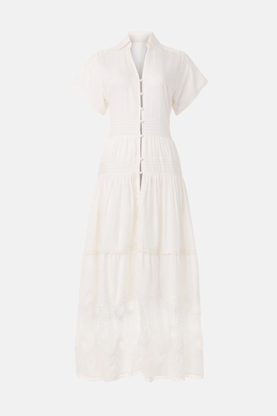 White lace (Main material: 80% Viscose, 20% Linen. Braid: 100% Cotton. Lace: 100% Polyester. Lower Lining: 100% Cotton). Casual Dress. V-neck. Short sleeves. Front button closure. Shoulder to hemline length: 53". Imported.