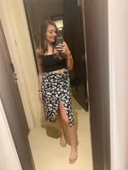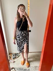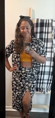 So this looks cute on. However- it really is only suitable as a bathing suit cover up, although why you’d use a dry clean only skirt for that, I don’t know. When you sit, you can see you underwear because it’s like a wrap skirt. It’s really odd. Idk how you could wear this out.