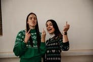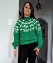 Wool blend, easy to layer, fun take on a traditional Fair-isle pattern. Great for holiday, themed events, fall/spring, skiing