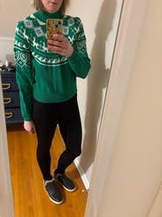 Nice, comfy sweater for every day. Regular fit; neither tight nor oversized. It tends to photograph more cool, but the actual color is a bright, neutral-warm Christmas green. It’s not actually a Christmas sweater, but I did have to explain to someone on a Zoom call that the long-necked artiodactyl in the design is an ALPACA not a reindeer!