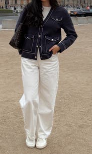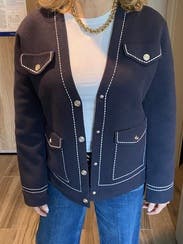 The Moussy Contrast Stitch Cardigan by Maje combines classic French tailoring with modern flair, featuring a boxy silhouette, flap pockets, and contrasting topstitching. Pair it with tailored trousers and loafers for a versatile look.