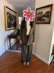Wore for a conference, got lots of compliments. Really love the fit and overall look. Oversized but not baggy, just the right length. Wish I could keep it!