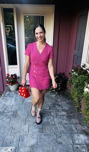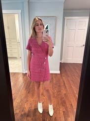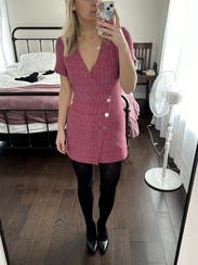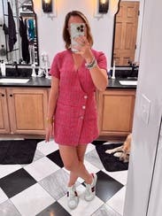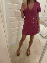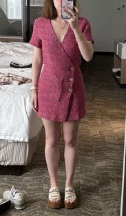 professional in pink. tweed goes girly in this faux-wrap mini dress. with a slit back for a little spice.