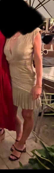 I chose to wear this stunning dress for my 10 year vow renewal celebration. It was perfect for a formal dinner and drinks afterward. The shape of the dress is flattering and artistic, which is why I chose it. The color is like a light silver/cream. The top was loose for me, so if you also have a smaller chest, plan to pin or stick it in place. I’m so glad I chose this dress!