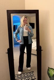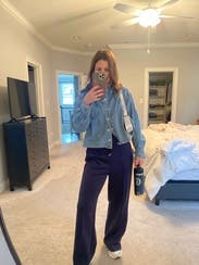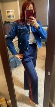 Definitely run a little small. I sized up and they were still a little snug in some areas but that might be a me issue LOL. I tried it with the jacket like the model had but that looked weird since the navy's were different colors. Recommend a darker top, I did black long sleeve. Definitely need a sneaker or shoe with a bit of a platform. I'm 5'5 with long legs and these still almost hit the ground. LOVED THEM THOUGH! Got so many compliments. Chic, model off duty, cool girl outfit <3!!!!!!!!!!!!!!!!!!!!!!!!!!!!!!