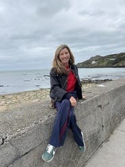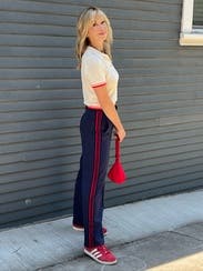 These navy blue track style pants with red stripes are one of my favorite rentals. So many compliments! Paired with a cropped red Free People sweater for a perfect tour outfit in Ireland!