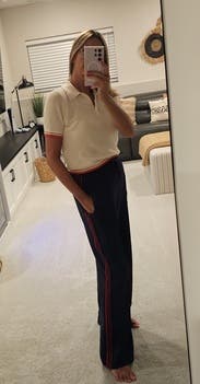 These elevated track pants are darling. I went with the size recommended but wish I had a size smaller. Just a little big in hips and legs, but still wearable. Rented the Sandro polo to go with. Easy outfit.