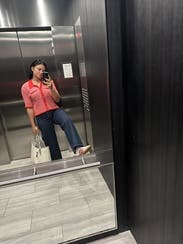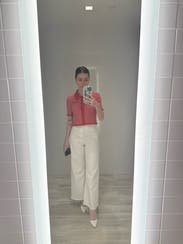 Loved this so much I almost kept it! Perfect for work, but it is a bit cropped so I couldn't raise my arms and it only worked with high-waist pants. The knit is lightweight and breathable. Looked great for headshots!