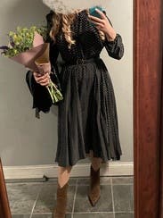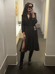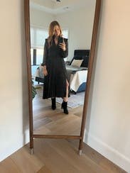 I love this dress because you slip it on and you instantly look chic. The neckline is a bit low but I like a deep V, and the two slits are super sassy. They give an otherwise potentially overly sweet-looking dress some edge. The torso was a bit long on me since I’m petite and I wanted more of a cinched waist so added a belt and really liked the way it bloused/flared out. I probably could have sized down - the waist is elastic and the top was roomy on me. It still worked though, and it felt like an effortless but dressed up look.