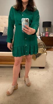 I love this dress! It’s comfortable and lightweight, and an absolutely gorgeous deep emerald green. The lightly gathered waist and ruffled hem felt feminine without being too frilly, and worked really well with my broad shoulders. It worked great to show my shape, which was nice since a lot of other shirt dress styles make me look boxy. The only thing that felt a little odd at first was the loose dolman sleeves. The cuffs are buttoned so that they fit loosely, so when standing straight, the sleeves were a little too long on me. However, this allowed for a lot of movement in the arms, so I felt like it was a good trade-off for comfort. The snaps are functional, but the waistband is one piece, so the dress still needs to be pulled on. I would definitely rent this one again!