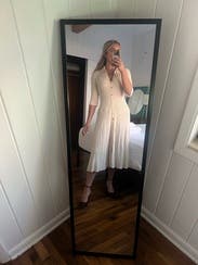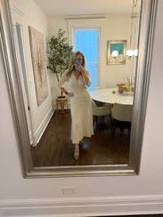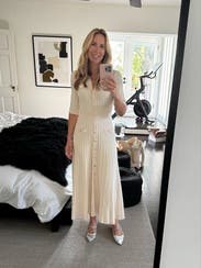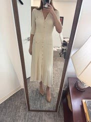 This dress was a standout! The heavier fabric gives it structure and makes it very flattering, while still being extremely comfortable to wear all day. It has such a classy, timeless look, and the subtle shimmer gives it an unexpected pop that makes it feel special. I received lots of compliments and even considered purchasing because it’s such a versatile classic in a neutral tone. It can easily transition between seasons—pair with a darker heel and bag to wear as a winter cream, or keep it light and neutral for spring/summer. Definitely a closet staple.