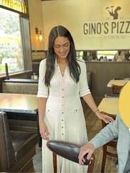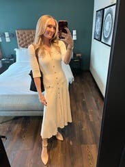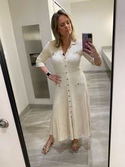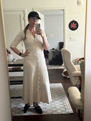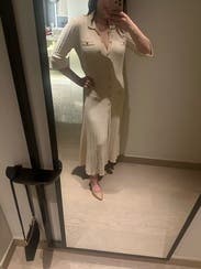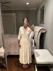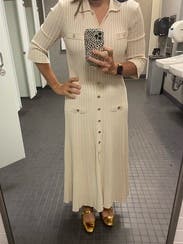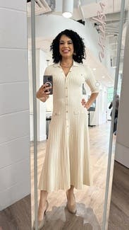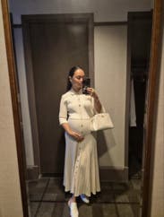 This dress was super cute and very polished, with subtle gold shimmer woven through the fabric that gave it an elevated look. I wore it while speaking on a panel and felt both confident and professional. The pleated design and button-down style were flattering, especially with a belt to define the waist. It is on the heavier side, which makes it better suited for cooler days, but overall it was a standout piece that photographed beautifully and drew compliments.