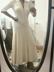 Good fall/winter basic. Heavy knit for warmth but still figure flattering. Cream color with the right amount of sparkle to keep it interesting. Was a smidge loose and could have sized down but the more conservative fit makes it good for work wear. Longer length but ok for shorties.