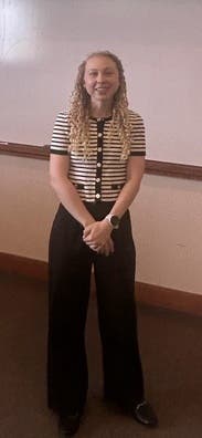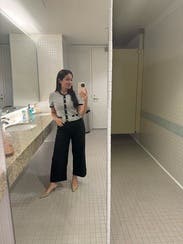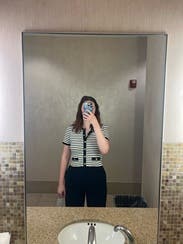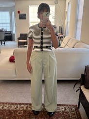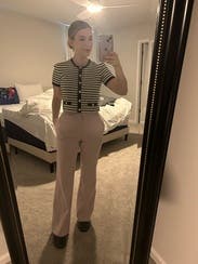 Such a cute preppy top. It’s a little short but with high waisted pants appropriate for work.