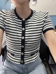 This chic Maje cardigan features classic black and white stripes with elegant gold button detailing. It gives off a timeless Parisian flair. Pair with a sleek black skirt or trousers for a sophisticated ensemble.