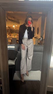 Wore in Paris. This is a perfect classic crop jacket. It is a little itchy, but fits true to size and looks great with high waisted bottoms.