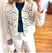 Didn’t expect to love the style of this jacket as much as I do. It’s not too heavy but it’s not a lightweight crochet. I’m a 34B and am wearing the size 1. The buttons are a snap closure with champagne/gold hardware. The description says it is white but is definitely an off-white/cream color. It can be dressed up or down.