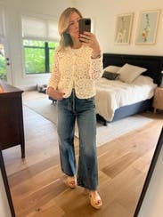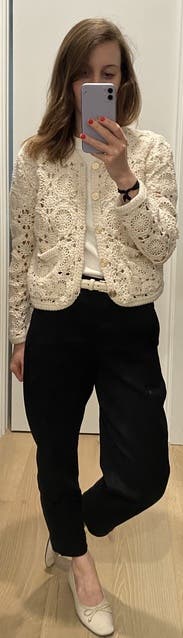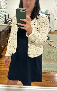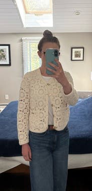 Loved this! Wore it both as a jacket over sun dresses and also as a cardigan on a chillier day. Love the crochet and the expensive feeling/looking gold buttons. It’s a heavy material and has some wool in it. Too hot for anything over 70 degrees but a great piece. I’d buy it if it were a little less. Only downside is it is a touch scratchy.