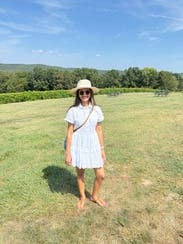 Lovely white dress that can be dress up or down. I wore it for a full day of exploring Barcelona and I remained comfortable. The eyelet detailing is precious!