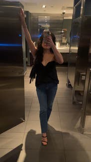 This top is structured and wasn't very comfortable sitting in traffic for an hour. I possibly could've sized down for my bust but I have some rib flare post pregnancy and wouldn't have been able to sit for long. I am small busted and could've gone bra less but chose to wear sticky inserts. Wouldn't recommend over a C cup. I got it to wear to Vegas and when plans changed, I felt great in it for a nice dinner out paired with black jeans. Would rent again!