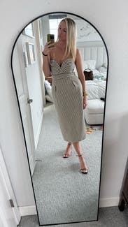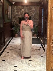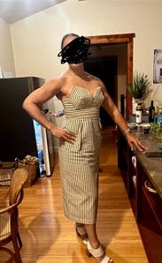 Well constructed, comfortable and a showstopper. Felt super glam all day. I chose my usual size 8 and the waist was perfect. The top was a tad loose but nothing a structured strapless bra couldn’t fix.