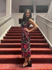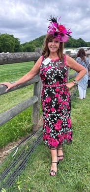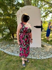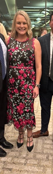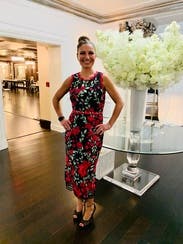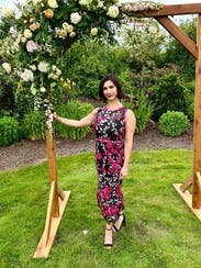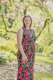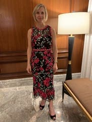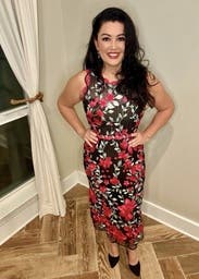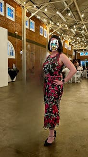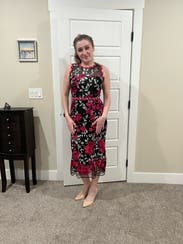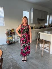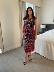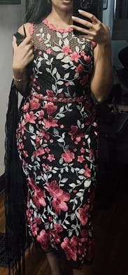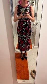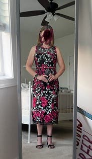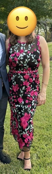This is a beautiful dress - more so in person as the magenta flowers are very vibrant. That said, the skirt is tight around the legs so I had to be careful getting in and out of cars and getting anything from the ground (including putting my shoes). Overall a great dress for a somewhat less than formal (but still fancy) event. I would rent this again!