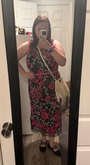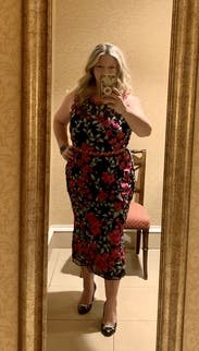 Wore this Marchesa dress to my daughter’s college graduation yesterday along with this Maje bag I also rented and LOVE! I went up a size due to my bust. I would have had zero issue in the 16 or even 14 with smaller than a DD. Tons of compliments (even one from the kiddo) definitely recommend!