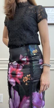 Beautiful skirt--tons of compliments. It's true to size and the fabric is gorgeous. It's versatile as well. Will rent this again!