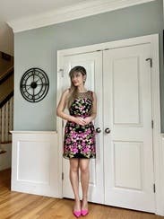 Absolutely loved this dress, wore it to the horse races for a fancy day and would highly recommend it for a similar daytime event, if you have a garden party, yea party, or shower you can’t go wrong with this! Loved the open back and the contrast with the more conservative front. Very flattering from all angles, got a ton of compliments!