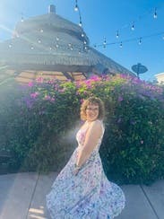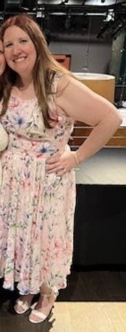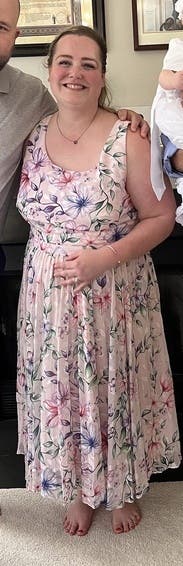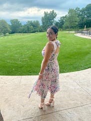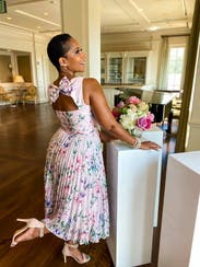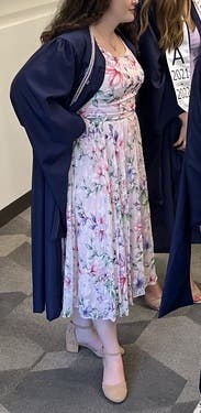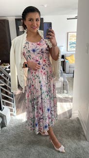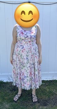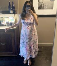 This dress was beautiful. The pattern and fabric gave this dress an ethereal flow that was perfect for a Sunday brunch wedding in June. The back is open and with a bit of boob tape I was able to not wear a bra with my DDD's (?!). The dress bodice and waist were tight around the middle, but the shoulder straps could have been a bit tighter to keep the bow in the back higher and tighter. Received many compliments and enjoyed elevating this dress.