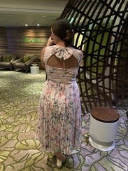 This dress was a nice conservative dress with a punch of skin. I love the large bow on the back, although it sits a little heavy and floppy. The dress was not tight anywhere and flowed out so it was comfortable for brunch and walking around the gardens. The pleating moved nicely.