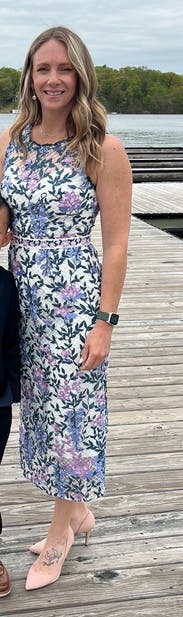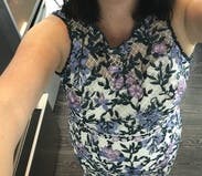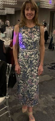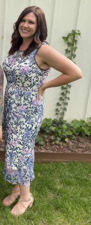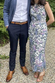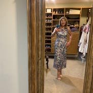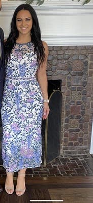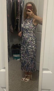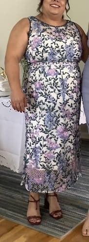 I typically wear flowy dresses since having children and my body is changed forever in ways that aren't what I am used to. With that said, I went out on a limb with this dress and I am so flipping happy I did! COMFORTABLE and BEAUTIFUL! I have a large bust and curvy all around, so I have to wear a bra and prefer not having low cut tops so that I can get my groove on at weddings, this dress checked off all my requirements. My husband and I danced the night away! I wore pink shoes and a pink shall, dress doesn't have pink in it but the colors complimented it perfectly. Don't hesitate, rent this dress!