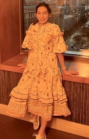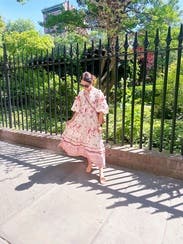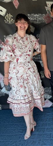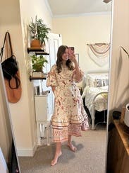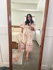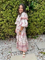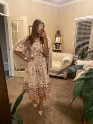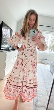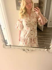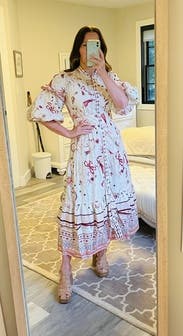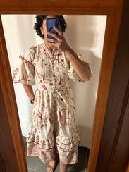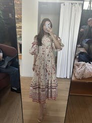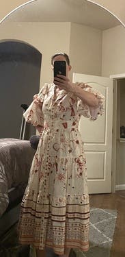 So many compliments- the print and details are very whimsical and delicate with the oversized sleeves adding to the effect. Easy to wear but might be a lot of dress on those more petite. Wore to a high tea at a chic spot and it felt perfect
