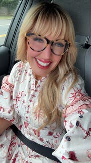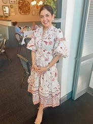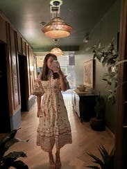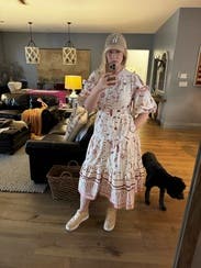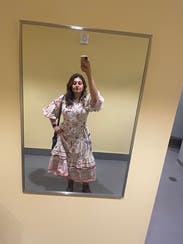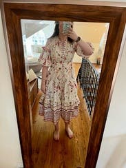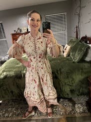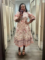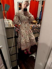 I wore this three times. Once with sandals, once with heels, and for the most fun (pictured), with cowboy boots. The cut is super flattering on the chest and waste. As an event presenter the pockets came in perfect to hold the mic and later to hold my cell phone. The pattern is fun. There were some definite moon and stars but it still felt flowery. I had to put a few pins between the buttons which is the norm for me. So if you’re chesty, plan for that. Rent it and have fun with it! I will rent again and put on my potential purchase list once it ages a bit.