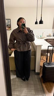 Loved this piece. Wore it out to dinner with friends and again to work. The jacket is oversized but the belt helps define your waist. Sleeves can be troublesome for me but these worked great.