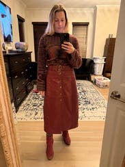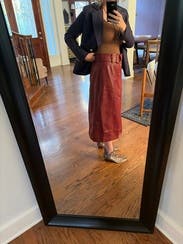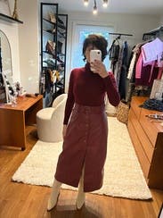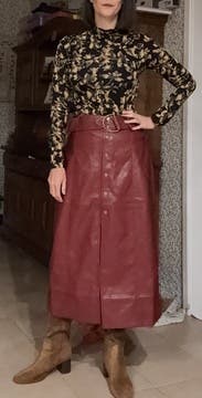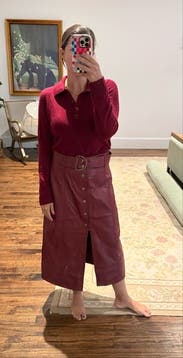 Overall, I really like this skirt- the color is gorgeous and perfect for fall or winter paired with boots. The belt detail and front slit make it feel elevated and chic. That said, it does run a little large, especially for shorter girls. I rented an XS but would’ve preferred an XXS for a more tailored fit. Probably looks even better on someone with a bit more height, but still a beautiful piece overall.