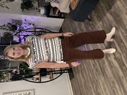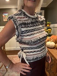 Loved this Marie Oliver sweater in L with yarn fringe. Giving me lion vibes but I like how well it pairs with brown or burgundy leather pants. The sweater is 80% wool and it is a bit itchy, but not so much to keep me from wearing it. Ties at the sides can show skin or not of tied tightly.