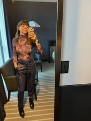 Wore this with the purple leather skirt as shown in outfit on RTR to a business meeting and a work conference. Great unique outfit!