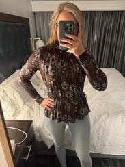 I wore a size small. The jersey material is comfortable and flattering. The ties on the side are adjustable so you can tighten them if needed. This top would pair well with black leather pants.